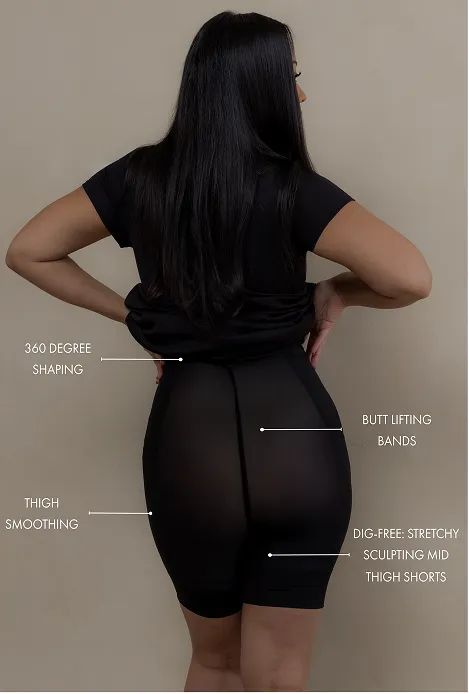 Sculpting Mid-Thigh shorts with butt boosting bands ensure a smooth hip and lifted booty.